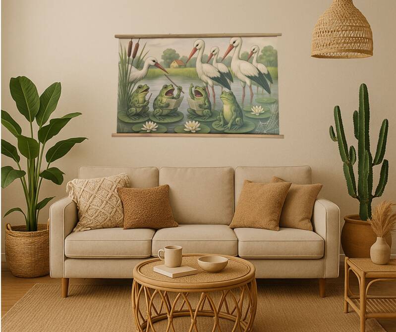 Eine Gruppe singender Frösche auf Seerosen gibt ein Konzert, während neugierige Störche gespannt zuschauen.