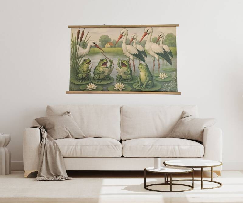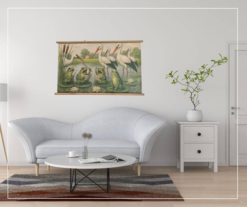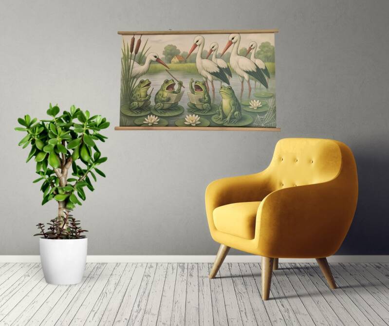 Dieses Schulposter „Störche mit Fröschen“ bringt eine verspielte und überraschende Szene zum Leben – im vertrauten Stil klassischer Lehrtafeln von früher.