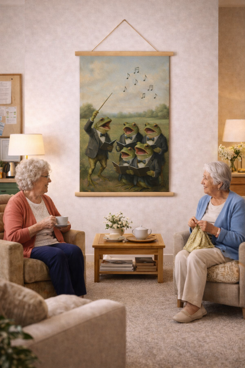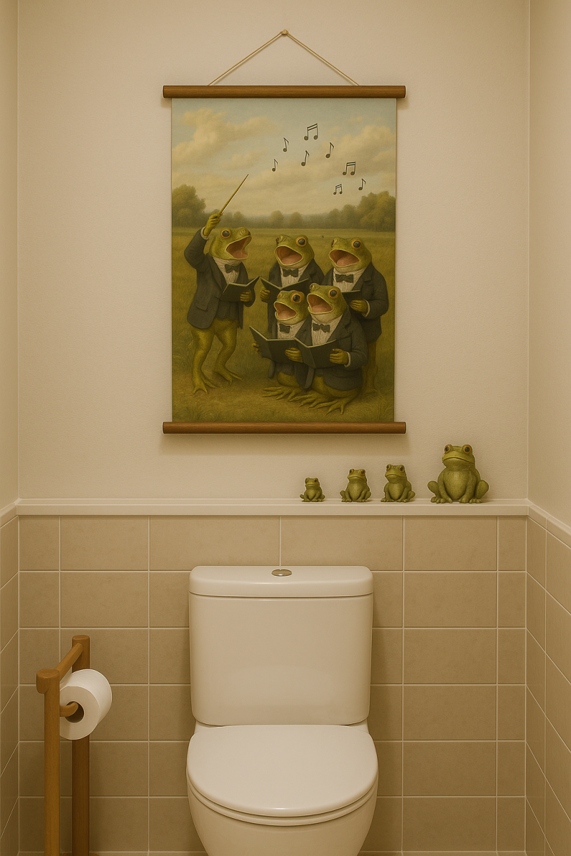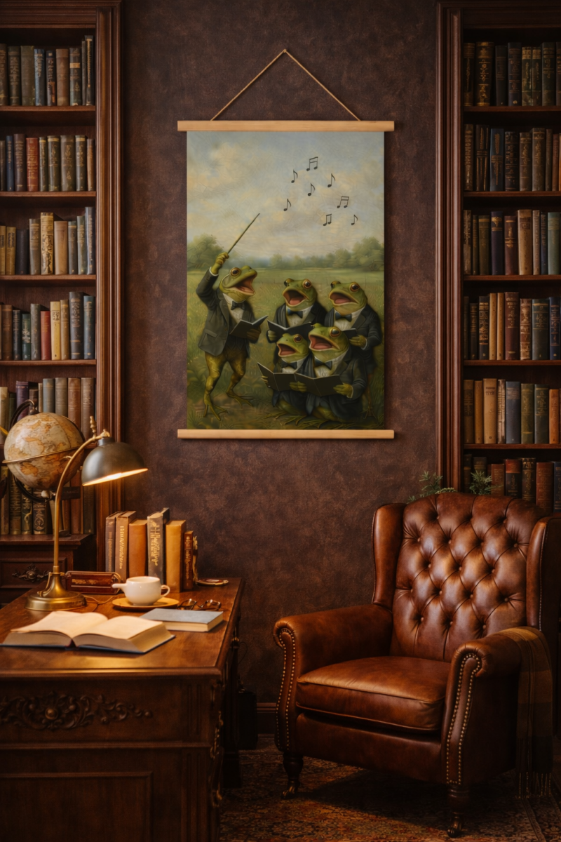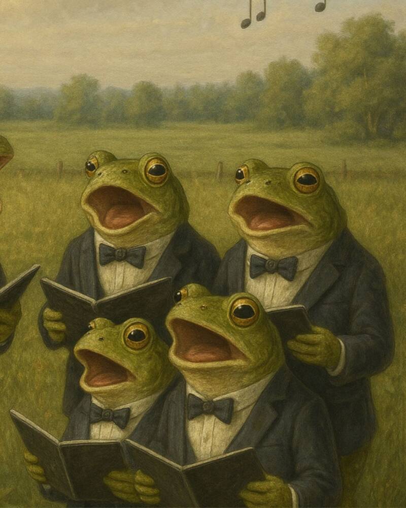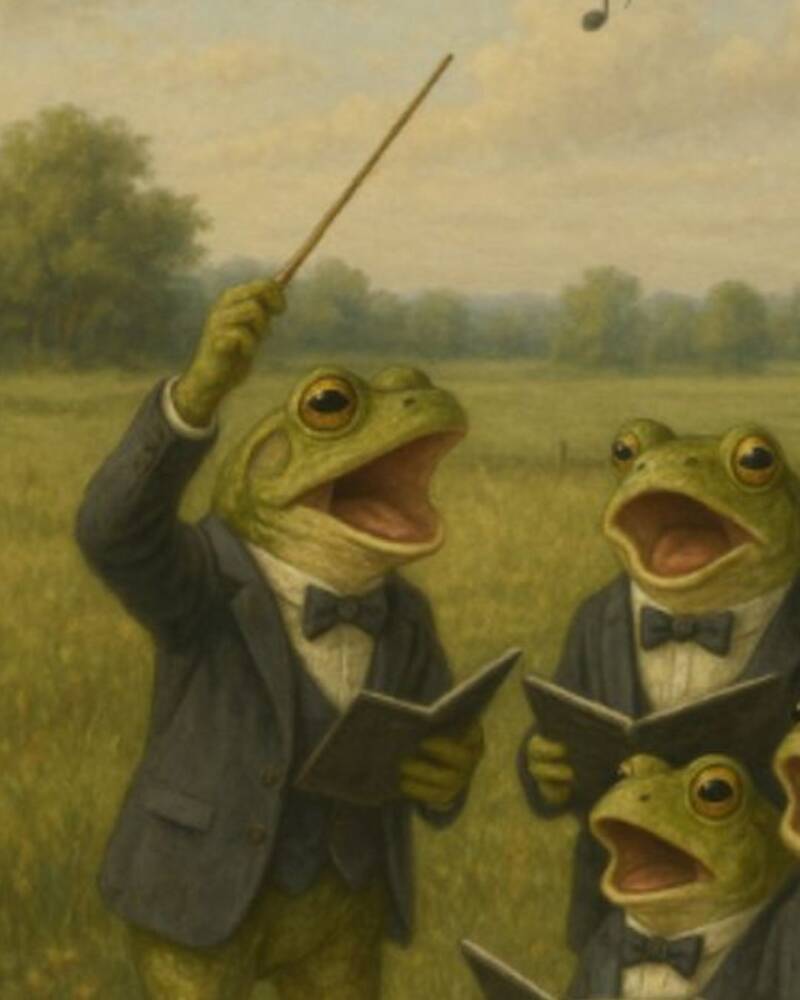 Elegant gekleidete Frösche singen gemeinsam auf einer weiten niederländischen Wiese, geleitet von einem echten Froschdirigenten.
