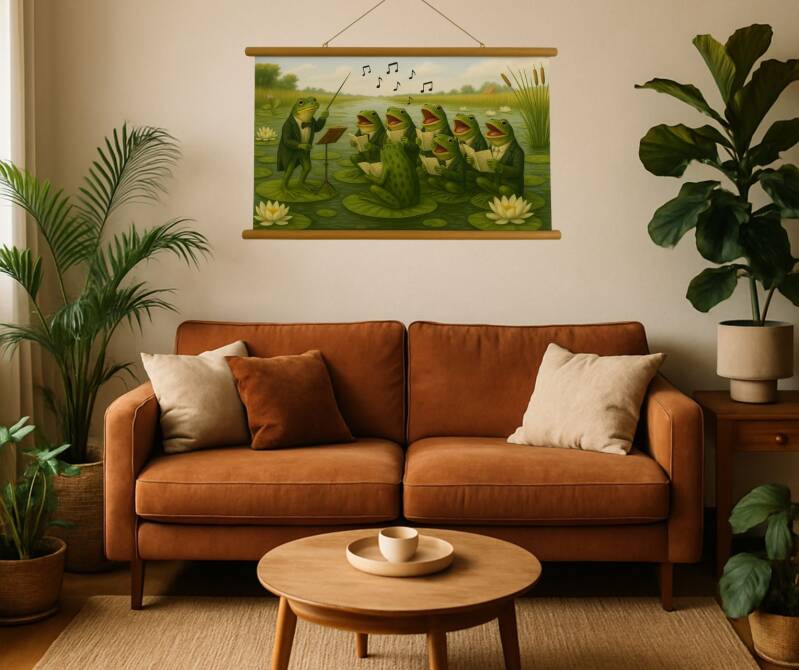 Dieses Schulposter mit Fröschen auf Seerosen verbindet Natur und Fantasie auf einzigartige Weise. Ein Dirigentenfrosch leitet ein kleines Orchester aus singenden Fröschen, die jeweils auf ihrem eigenen Seerosenblatt sitzen. Verspielte Musiknoten schweben durch die Luft und verleihen der Szene eine lebendige und fröhliche Dynamik.