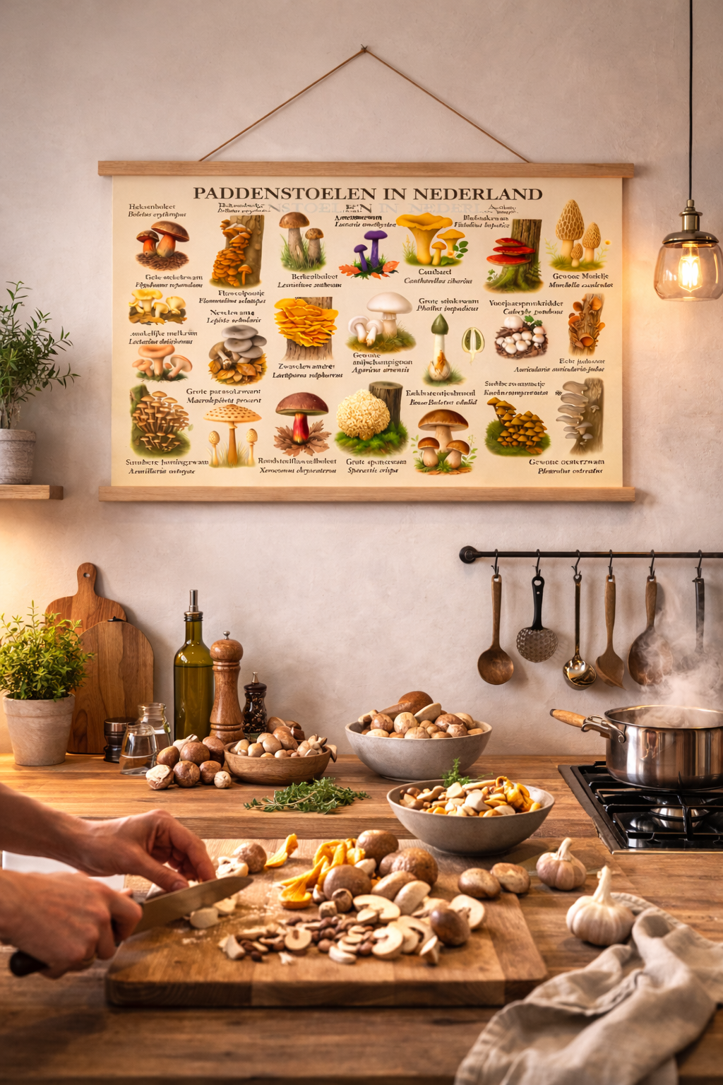 Auch botanische Motive spielen eine wichtige Rolle in der Kollektion. Das Poster mit essbaren Pilzen auf dunklem Hintergrund verbindet Wissen mit Ästhetik. Die dunkle Farbgebung bringt die Formen und Strukturen der Pilze besonders schön zur Geltung und schafft eine warme, ruhige Atmosphäre.