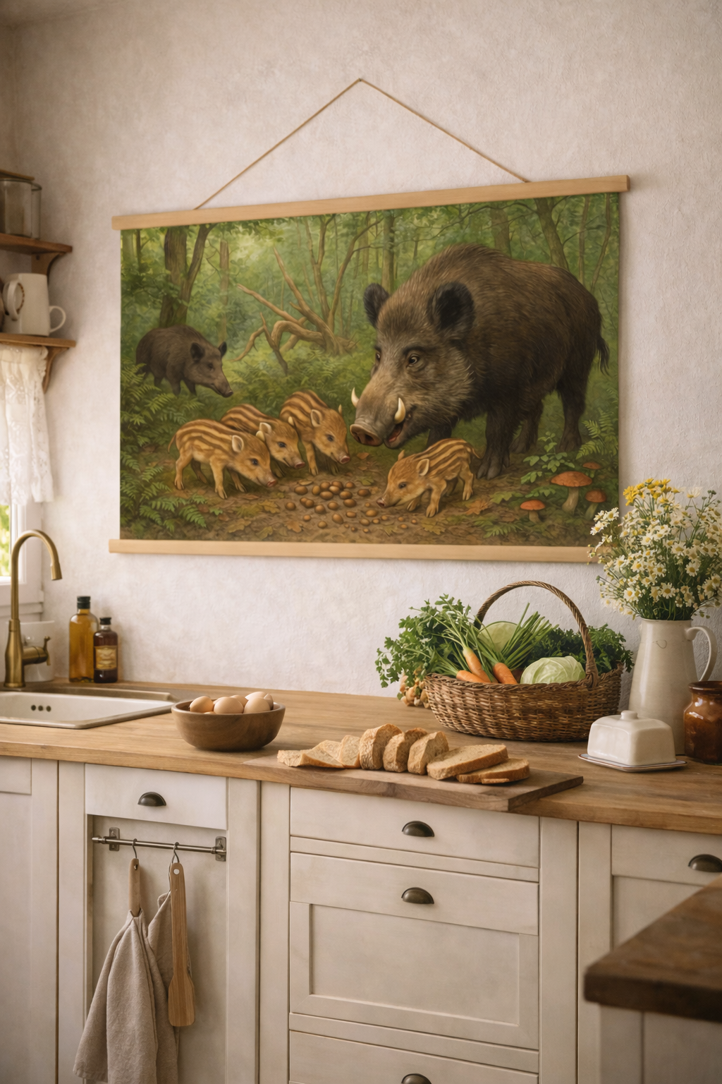 Ein weiteres besonderes Motiv ist die Szene mit Wildschweinen, die ruhig und natürlich in ihrer Umgebung dargestellt sind. Die Darstellung wirkt authentisch und bodenständig, ohne dramatische Effekte – genau das macht ihren Reiz aus.